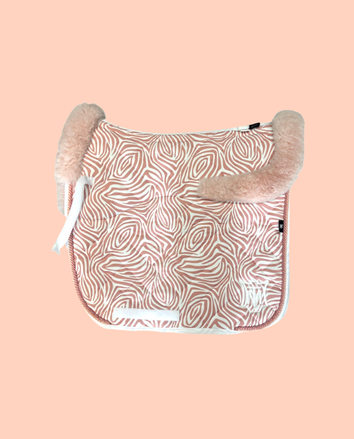 Ce tapis de dressage est une collection limitée ! Motif zébré rose avec mouton dessous. Ligne supérieure de forme anatomique, sans mouton à colonne vertébrale (SPINEFREE®) de Mattes. En laine d'agneau au niveau de l'assise de la selle - confort pour votre cheval. La laine d'agneau assure une bonne répartition de la pression, réduit les frottements et régule la température. De plus elle permet aux muscles de se développer sous la selle.