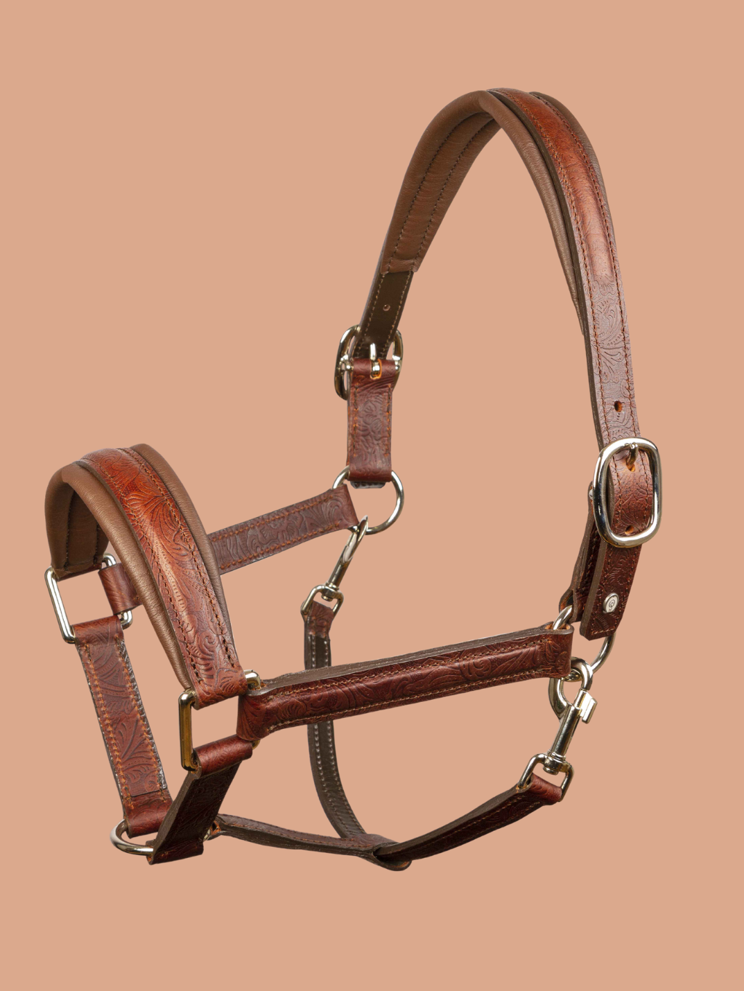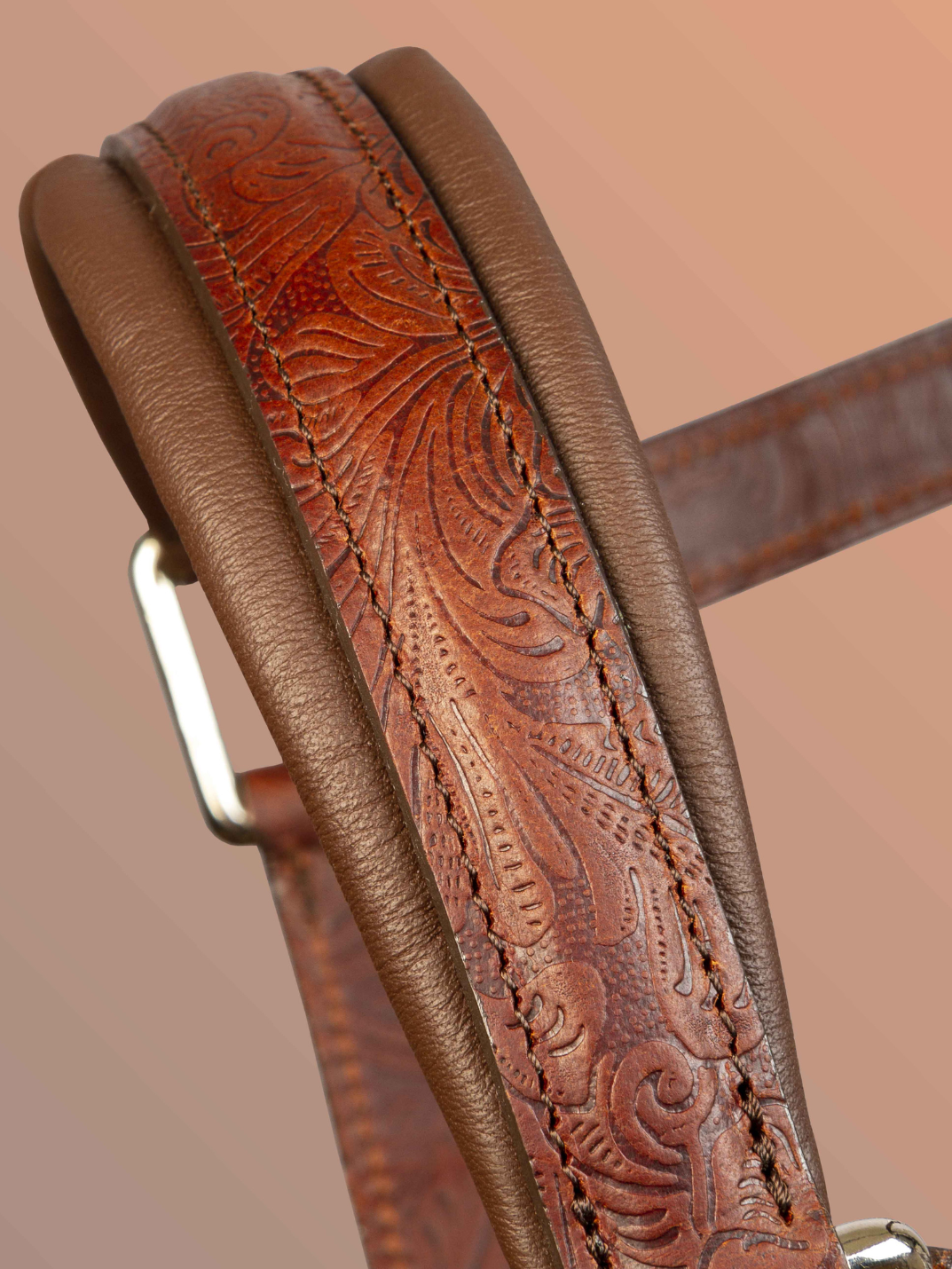 Licol de fabrication artisanale Otto Schumacher avec cuir motif baroque, doublure marron et boucle argentés.