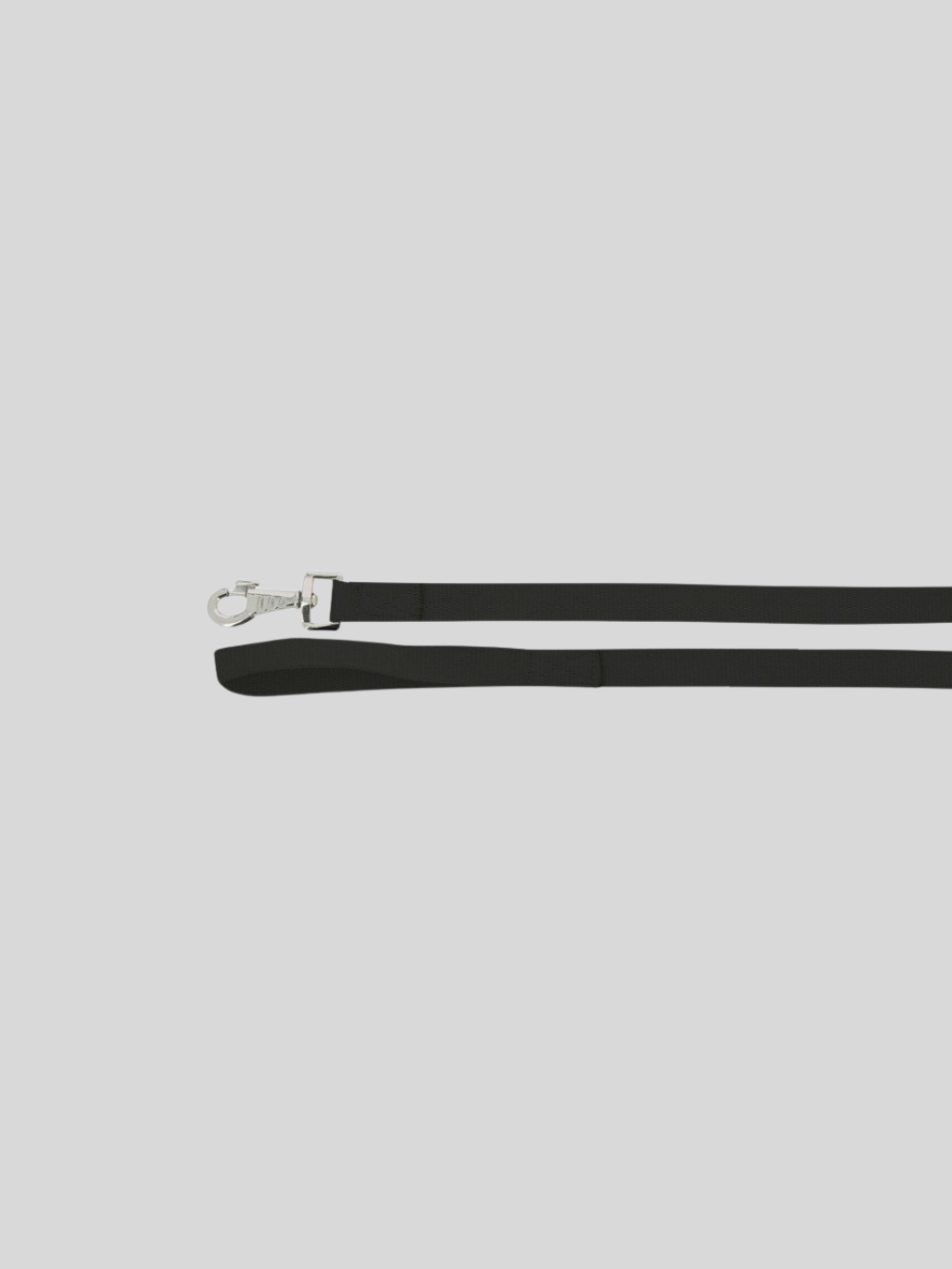 Longe en toile et cuir avec arrêt tournant en acier nickelé.