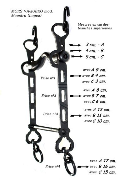 Mors Vaquero qui permet de changer d'embouchure, 3 positions de hauteur de branches différentes, 3-4 et 5 cm. Quatre possibilitées de prise de rênes et fournis avec quatre embouchures: nº 1-2-7 et 9.