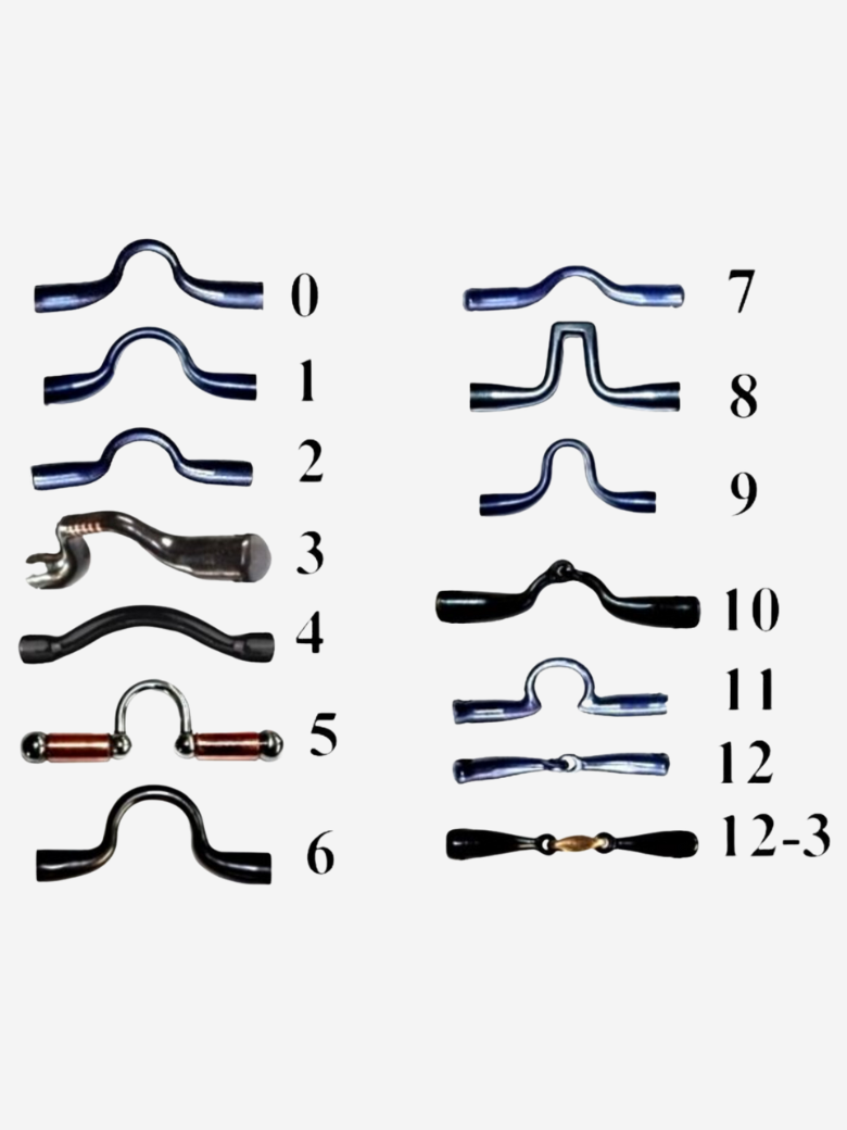 Mors de fabrication artisanale existe en plusieurs matériaux , dimensions, avec une barre droite et peut être fixe, articulé, mobile ou à rouleaux (gros canon).