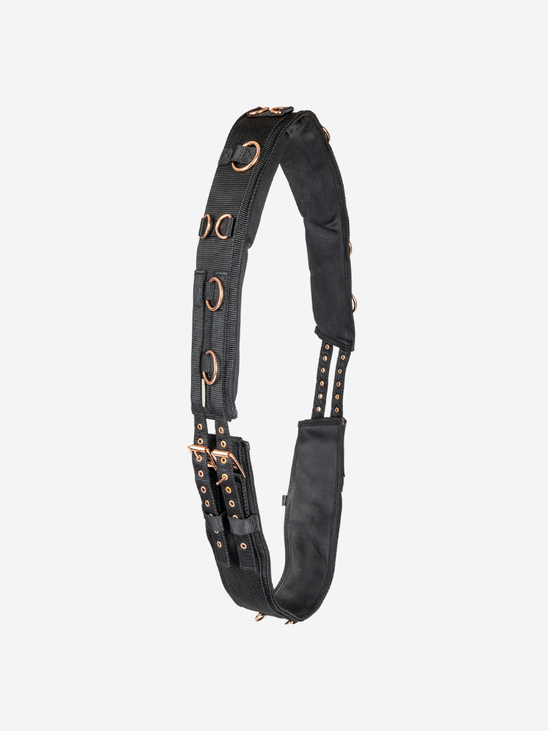 Surfaix particulièrement moelleux offrant un grand confort au cheval. Il s’ajuste facilement au tour de ventre à l’aide de deux boucles à rouleaux. Avec 12 anneaux pour une conduite à la longe personnalisée. Bouclerie rose doré.